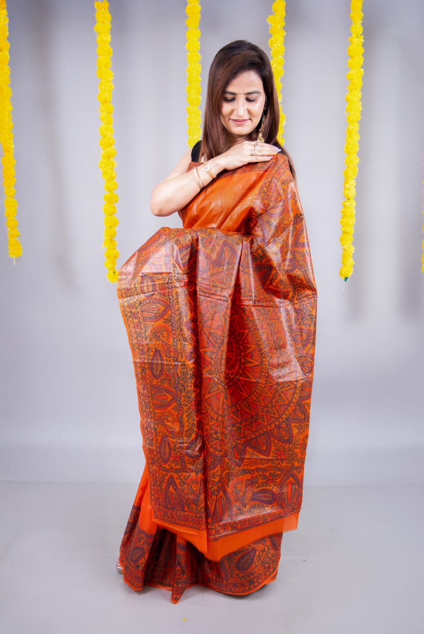 Handpainted Madhubani in orange colour paper silk, very soft, easy to wear.